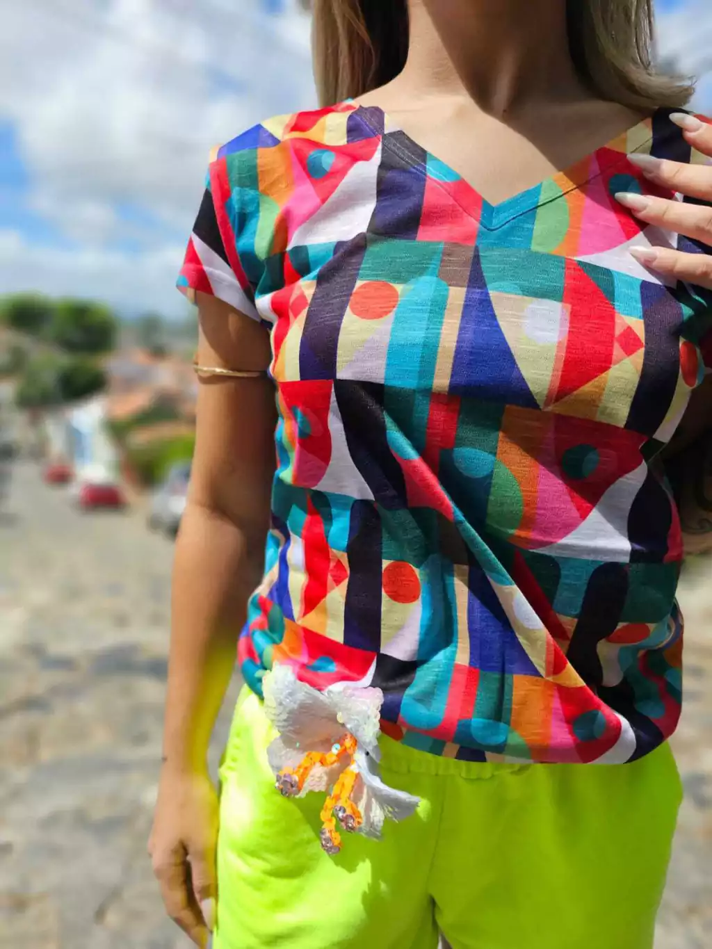 Com gola V e um design exclusivo, esta t-shirt combina praticidade e elegância, sendo perfeita para compor um visual descontraído sem perder o charme.