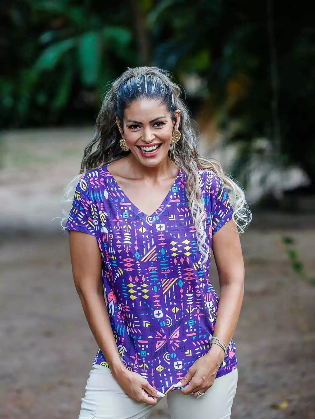 Com gola V e um design exclusivo, esta t-shirt combina praticidade e elegância, sendo perfeita para compor um visual descontraído sem perder o charme.